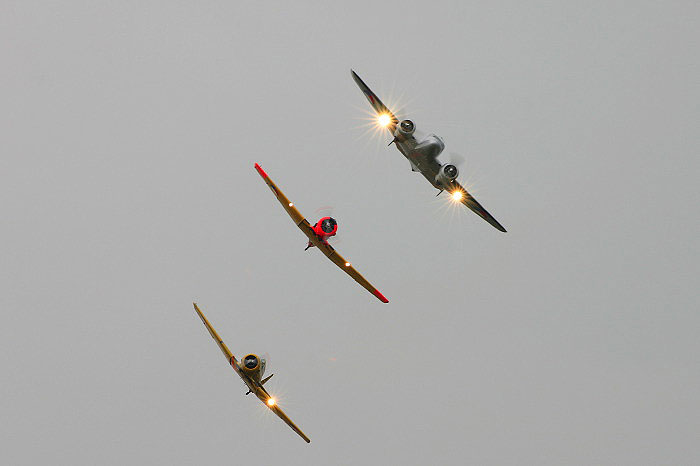 Schönes Bild: Die Beach 18, in Formation mit zwei North American Harvard T 6.