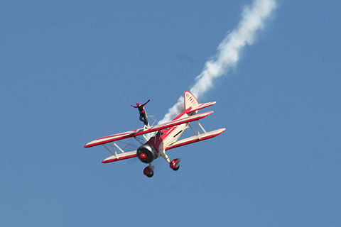 Bei bestem Fliegerwetter konnten am Samstag und Sonntag die Besucher des Fliegerfestes in Bonn-Hangelar ein fliegerisches Ereignis der Sonderklasse genießen. Aus Anlass des 100-jährigen Bestehens des Flugplatzes lud die Fliegergemeinschaft Nachbarn und Luftfahrt-Interressierte aus der Region auf den Flugplatz ein. Und das Programm hatte es in sich! Als Spektakel ersten Ranges natürlich Peggy Krainz als "Wingwalkering", eine in Europa wohl einzigartige Vorführung.